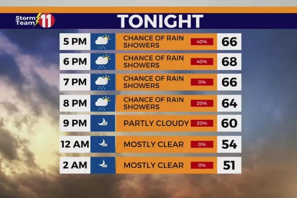 The Storm Team 11 forecast calls for a 40% chance of scattered showers through early Saturday evening. Skies will then gradually clear later tonight with a...